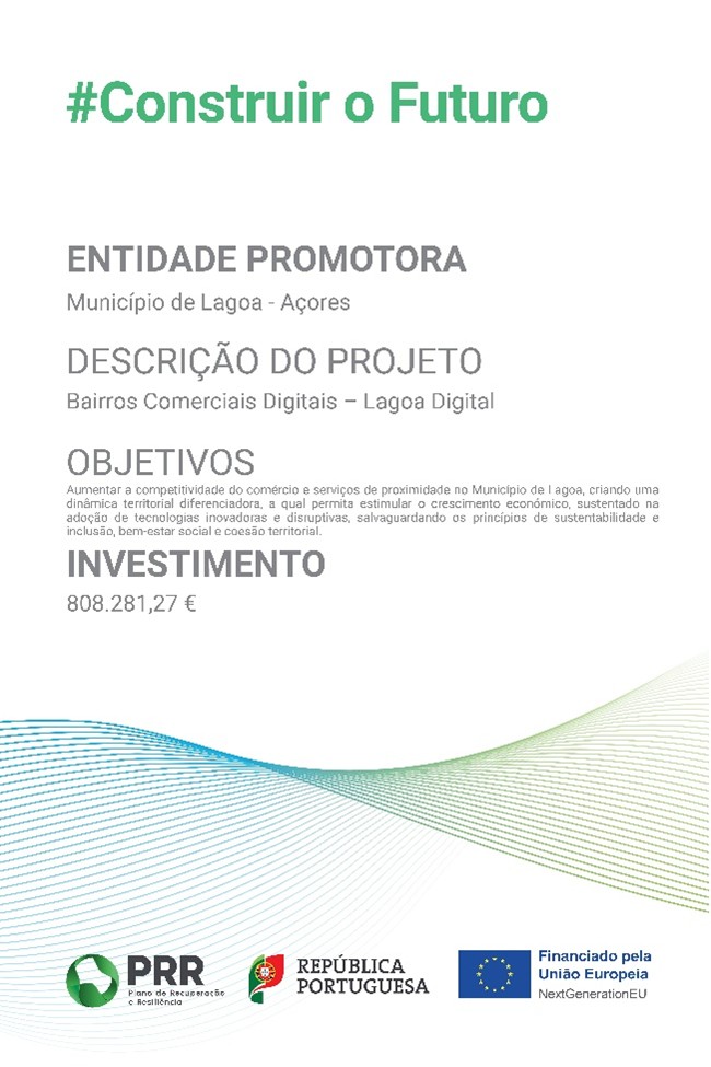 O Bairro Comercial Digital de Lagoa – Açores é um projeto financiado pelo Plano de Recuperação e Resiliência (PRR), um programa de aplicação nacional, com um período de execução até 2026, que visa implementar um conjunto de reformas e investimentos destinados a repor o crescimento económico.